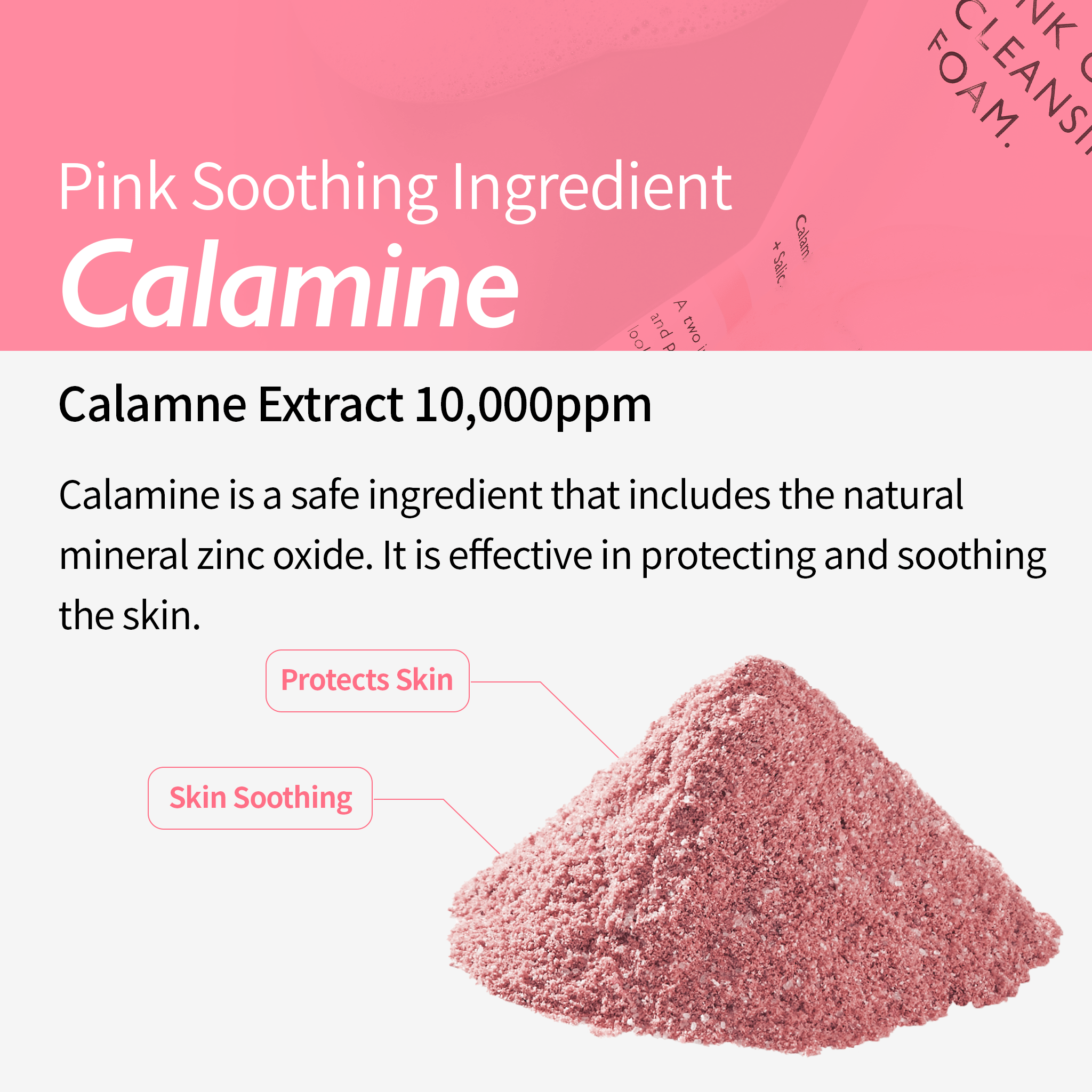 Calamine: 10,000ppm of Calamine Powder to help reduce excess oil, improve skin texture, brighten dark spots & hydrate your skin.